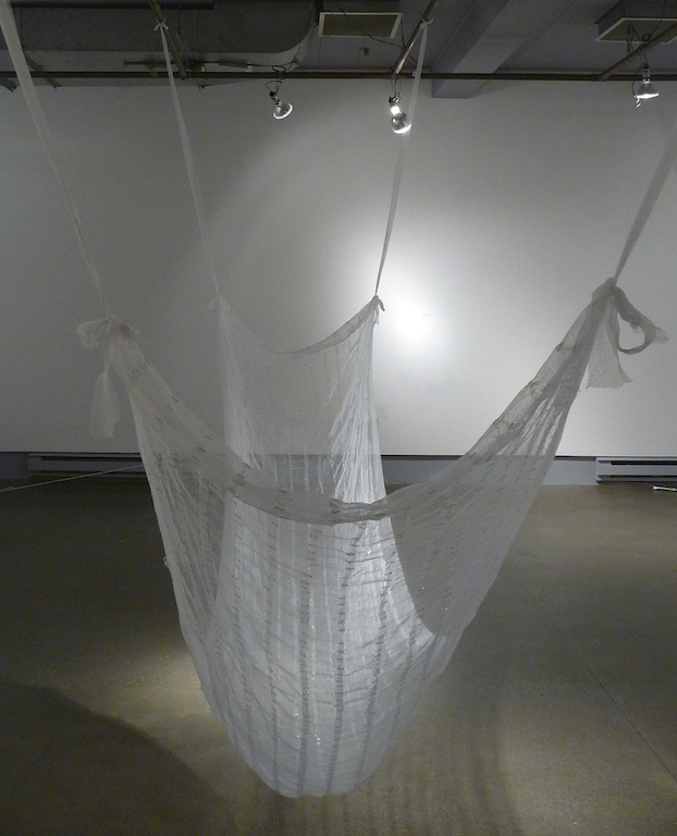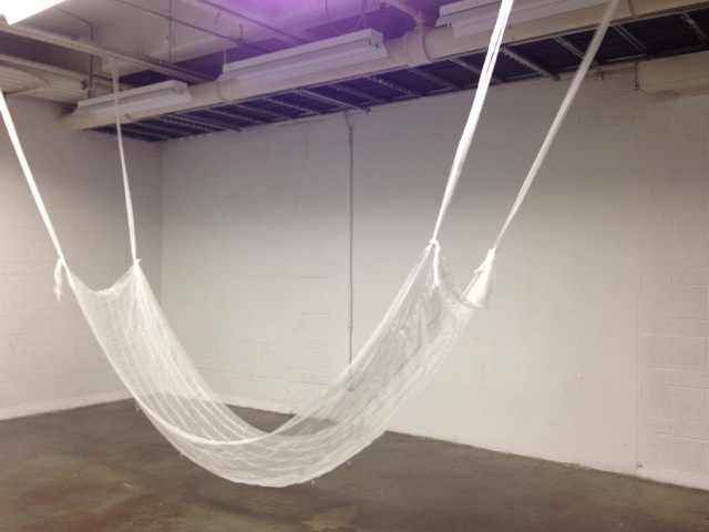 Hammock explores the physical capacities and psychological dimension of mundane objects. The process for making this object underlines the transformative qualities of 6000 sharp staples and 106 yards of soft, thin medical gauze blow by blow.