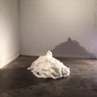 Each day, needles pull the pillow form apart, and the very needle used for the task stays inside the mass. A whole pillow form transforms into a 38 foot long twisted viscera with several needles poking at it.
