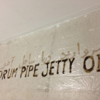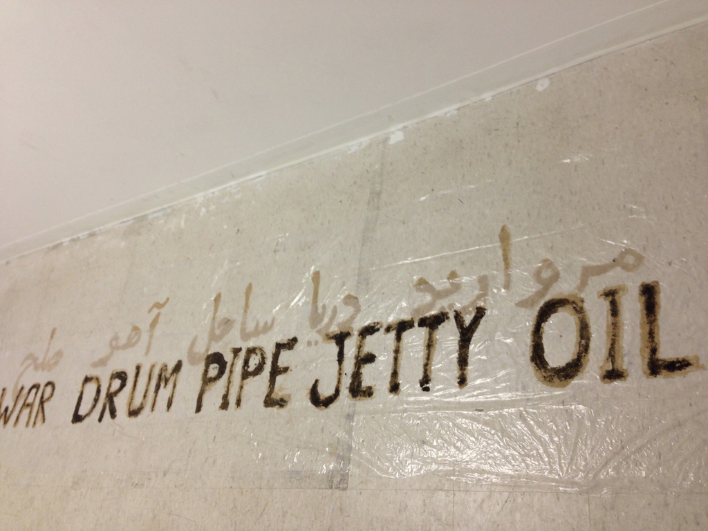 Words such as Pipe or Drum did not exist in the local conversations before the oil export. Oil-writing these words in sand highlight their contrasting meaning in the life of the Islanders and how one word is overwritten by the other. As such, the War floats over the Peace, and the Beach is submerged under the Jetty.